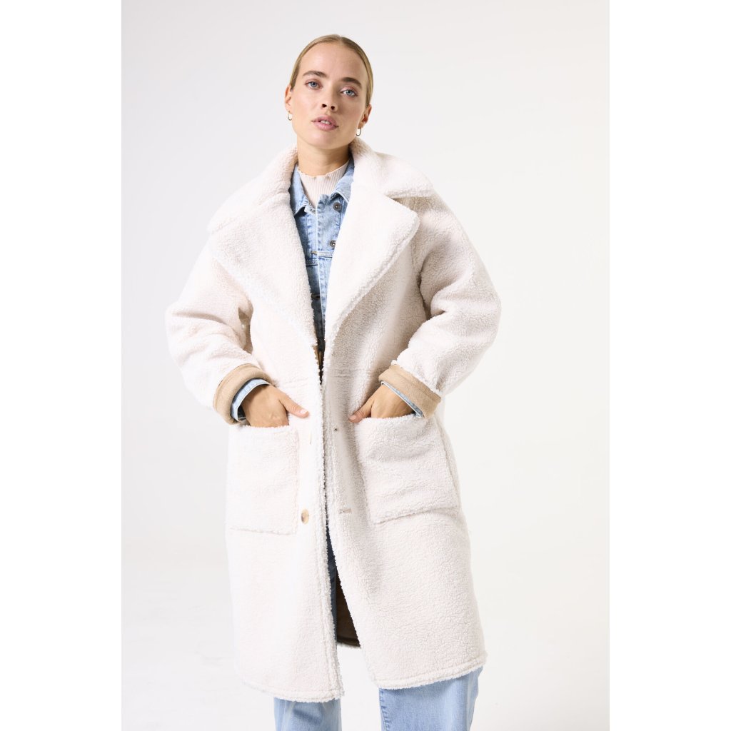Pozoruhodný obojstranný kabát od značky Garcia spája nadčasovú eleganciu s praktickým dizajnom. Je vyrobený z kvalitného mäkkého materiálu, ktorý pôsobí ako imitácia semišu z jednej strany a ako hebký kožušinový flís z druhej. Vďaka svojmu obojstrannému prevedeniu môžete kabát nosiť podľa nálady – ako klasický béžový kabát pre ležérny mestský vzhľad, alebo ako mäkký biely kožušinový kabát pre útulný zimný štýl. Kabát má dlhší strih, ktorý lichotí postave a poskytuje dostatok tepla aj v chladnejších dňoch. Široký golier, veľké vrecká a uvoľnený, mierne oversize strih dodávajú outfitu moderný nádych. Dostupný v béžovo / krémovo-bielej farbe.Dodatočné parametre