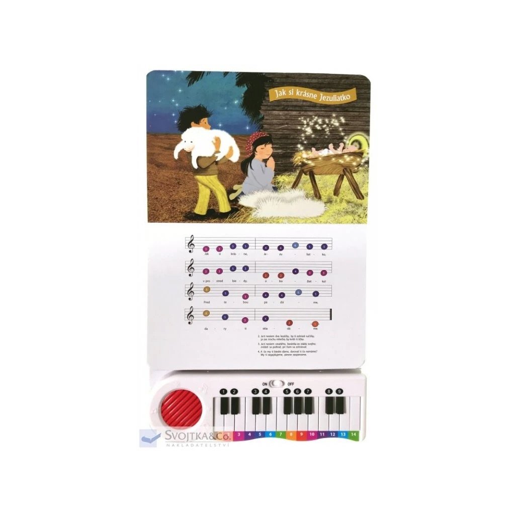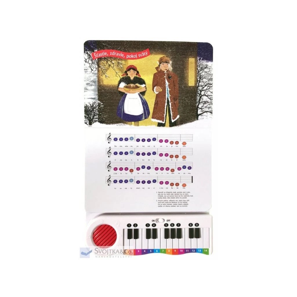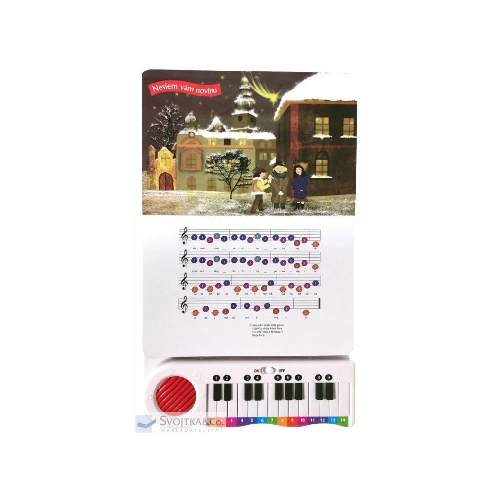 Táto knižka obsahuje 12 obľúbených vianočných kolied ľahkých na prehranie – Šťastie, zdravie, pokoj svätý; Ó, chýr preblahý; Nesiem vám novinu; Narodil sa Kristus Pán; Daj Boh šťastia tomu domu; Jak si krásne Jezuliatko; Sem pospešte; Do hory, do lesa; Čas radosti, veselosti; Búvaj, dieťa krásne; Vstávajte pastieri; Pásli ovce valasi. Ku knižke je priložené pianko, na ktorom si možné si koledy „vlastnoručne“ zahrať podľa nôt. Ľahké prehranie umožňujú rôznofarebné číslice nad jednotlivými klávesmi a notami. Kniha je doplnená pôvabnými ilustráciami, ktoré navodzujú vianočnú atmosféru.Dodatočné parametre
