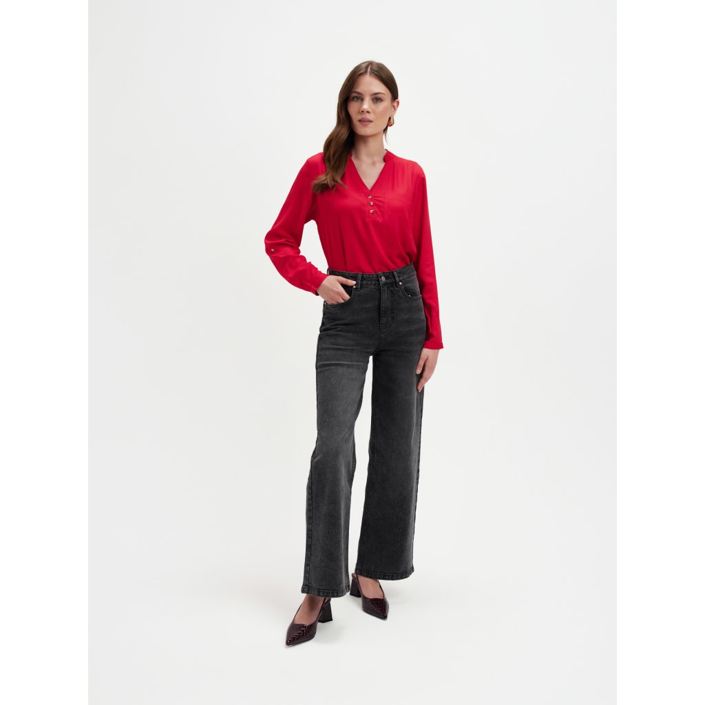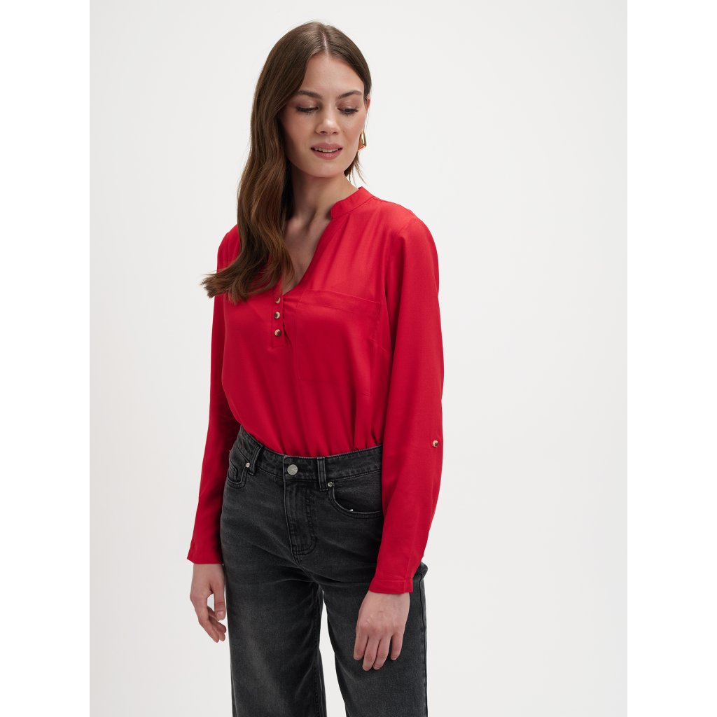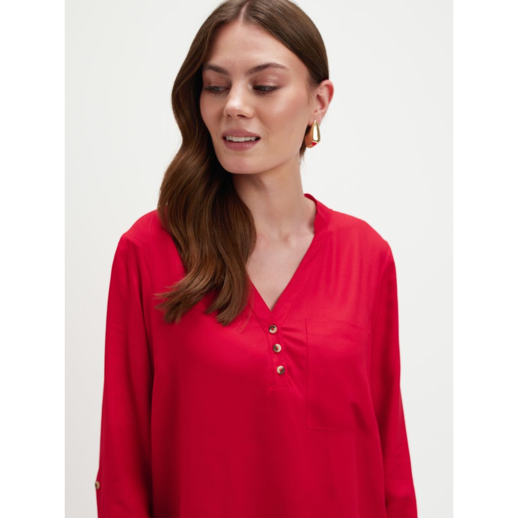 Táto elegantná červená blúzka od značky Top Secret dodá vášmu outfitu šmrnc a ženskú sebaistotu. Vyrobená zo 100 % viskózy, je ľahká, jemná a priedušná, ideálna na každodenné nosenie aj špeciálne príležitosti. Má voľný, splývavý strih a výstrih do „V“ so zlatými gombíkmi, ktoré pôsobia sofistikovane a elegantne. Náprsné vrecko a dlhé rukávy s manžetami dodávajú modelu ležérnu eleganciu a pohodlie. Perfektne sa kombinuje s tmavými džínsami, čiernymi nohavicami alebo sukňou z novej kolekcie Top Secret.Dodatočné parametre
