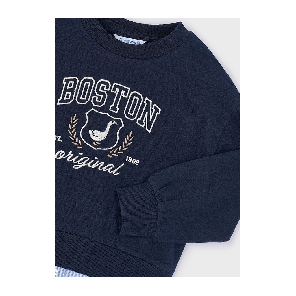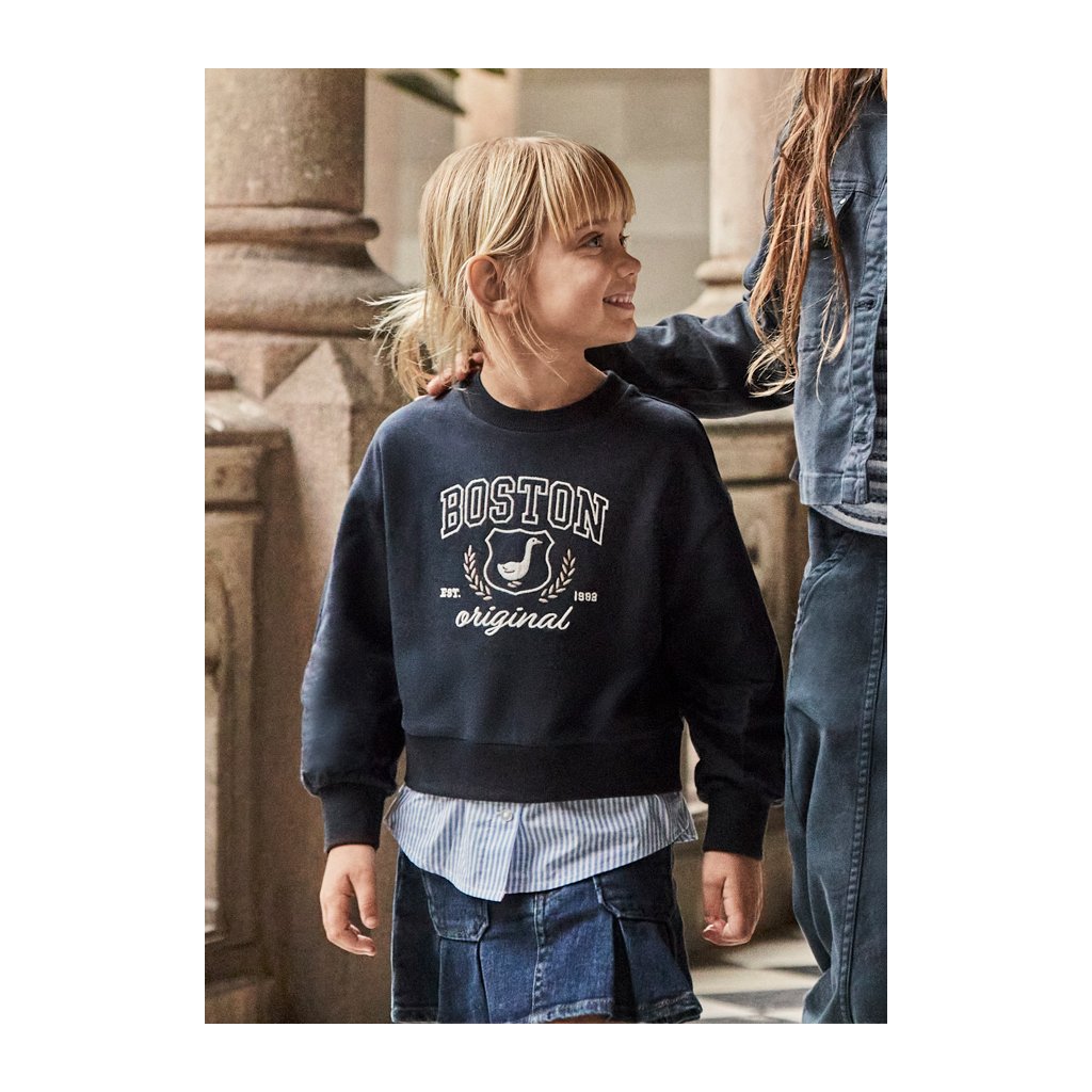 Táto štýlová mikina od Mayoral spája ležérnosť s eleganciou v jednom dokonalom kúsku. Tmavomodrý odtieň dopĺňa nápis Boston Original na hrudi, ktorý dodáva športovo-mestský nádych. Originálny vrstvený vzhľad s pruhovaným košeľovým lemom vytvára ilúziu dvojvrstvového outfitu – ideálny pre malé fashionistky, ktoré milujú módu. Mikina je vyrobená z mäkkej a príjemnej bavlny, ktorá zabezpečí celodenné pohodlie. Perfektne sa hodí k džínsom aj legínam a je ideálnou voľbou do školy, na výlety aj voľný čas.Dodatočné parametre