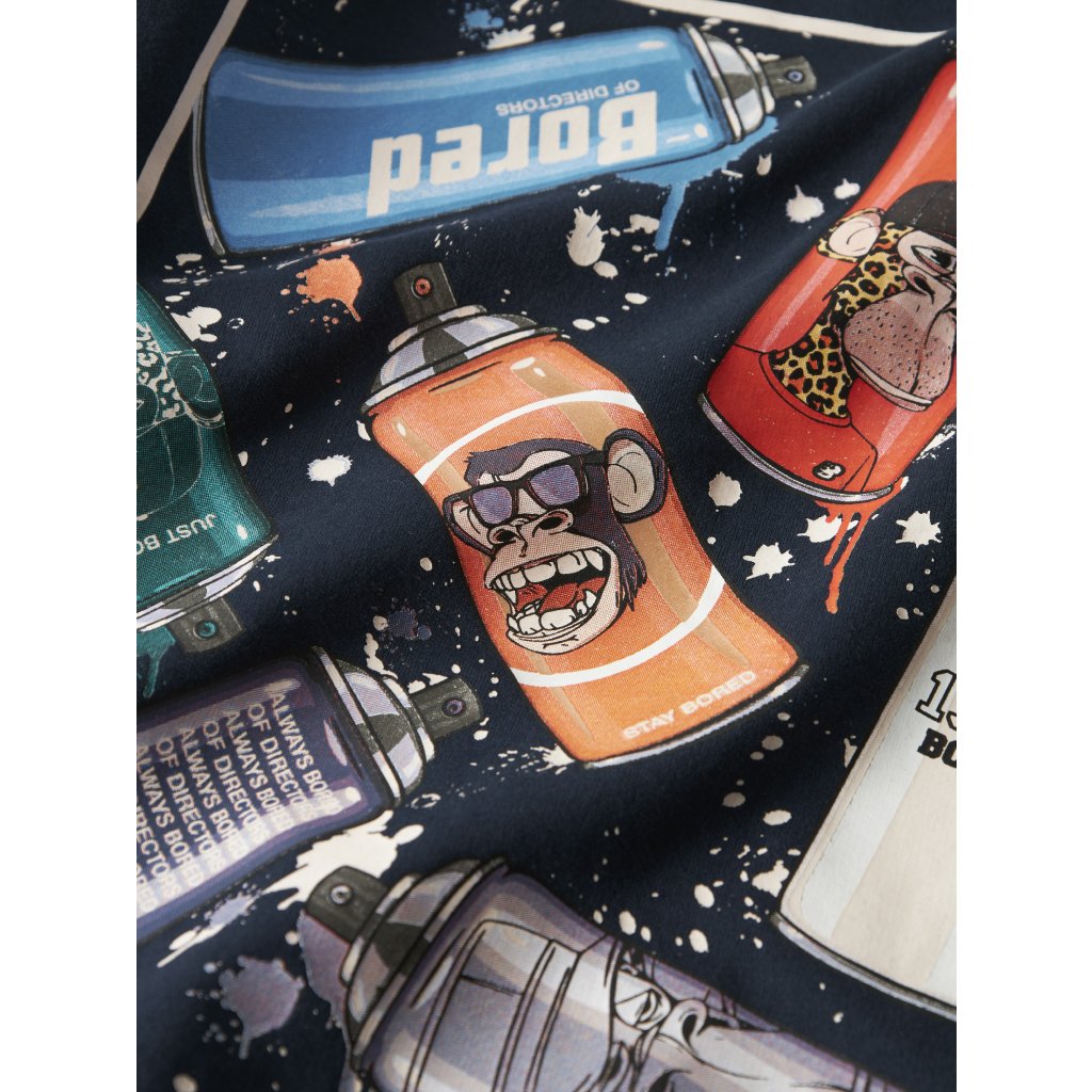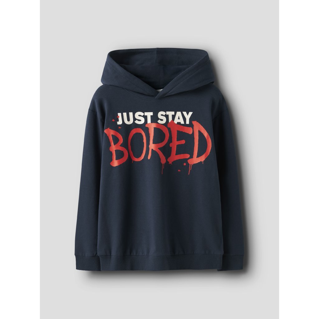 Štýlová tmavomodrá mikina od značky NAME IT zaujme moderným streetwear dizajnom. Na prednej strane má výraznú potlač s nápisom JUST STAY BORED v kontrastných farbách, ktorá dodáva mikine odvážny a rebelsky ladený vzhľad. Zadná časť je ozdobená veľkou grafikou so sprejmi a komiksovými motívmi, čo vytvára originálny a hravý efekt. Praktická kapucňa a rebrované lemy na rukávoch aj spodnom okraji zabezpečujú dobrý strih a pohodlné nosenie. Táto mikina je ideálnou voľbou pre chlapcov, ktorí majú radi mestský štýl a chcú vyniknúť originálnou grafikou.Dodatočné parametre