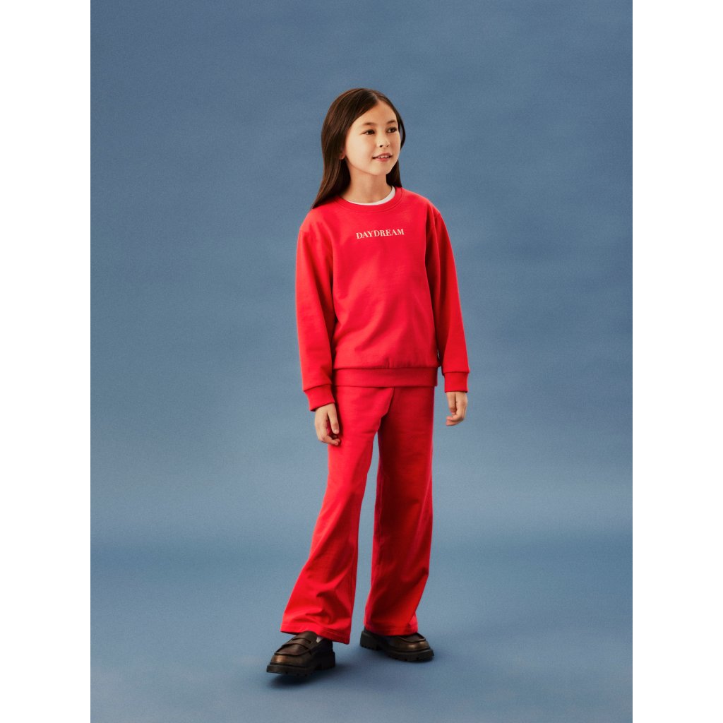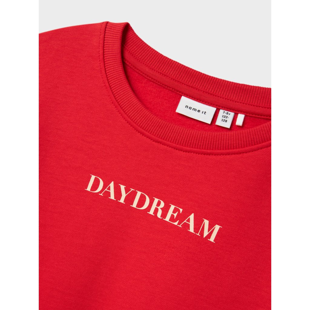 Zahaľte svoje dieťa do žiarivej farby a nekonečného pohodlia. Táto žiarivo červená mikina s minimalistickým nápisom "´DAYDREAM" od značky NAME IT je dokonalou kombináciou pohodlia a štýlu. Vyrobená z mäkkého, priedušného materiálu s prímesou recyklovaných vlákien ponúka príjemný pocit na pokožke a zároveň myslí na udržateľnosť. Klasický strih s okrúhlym výstrihom, rebrovanými manžetami a spodným lemom sa postará o to, aby skvele sedela a držala tvar. Odporúčame kombinovať s nohavicami alebo legínami z našej novej kolekcie pre dokonalý outfit na každý deň.Dodatočné parametre