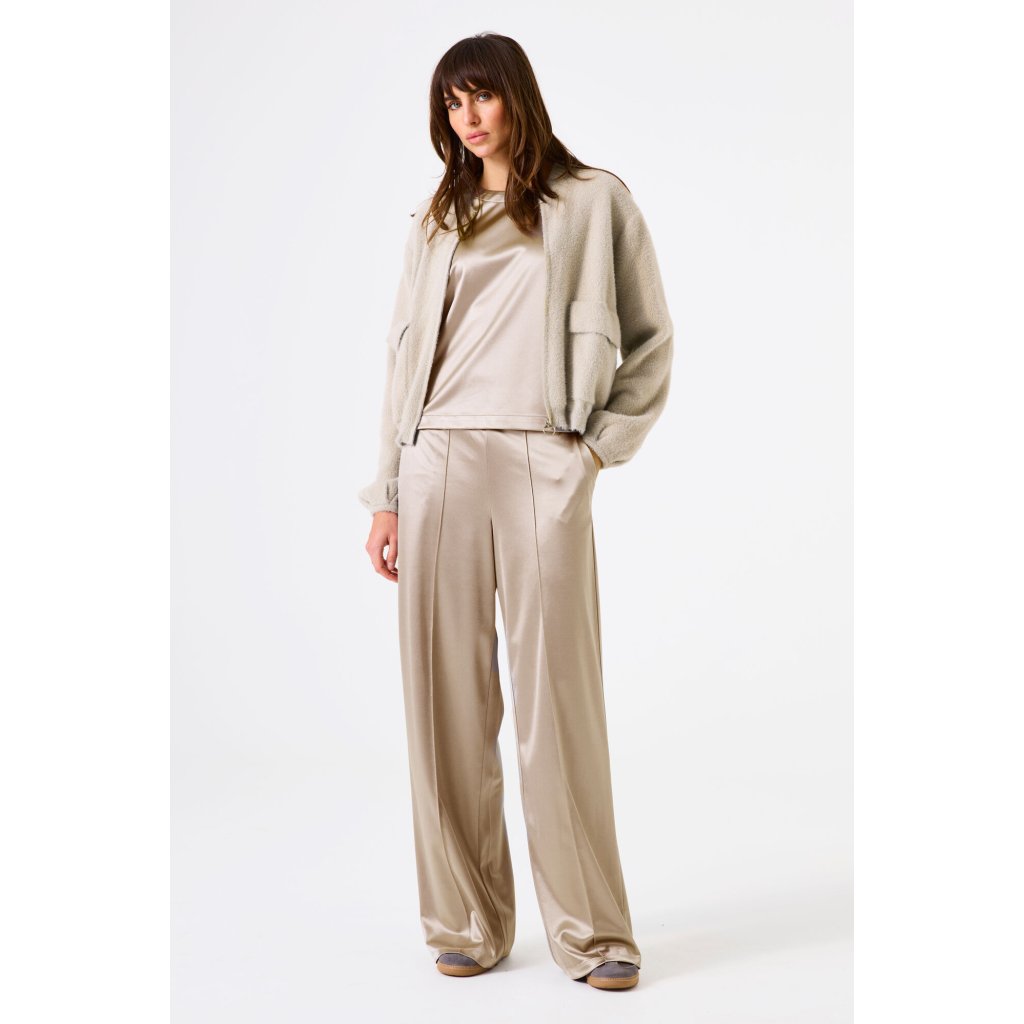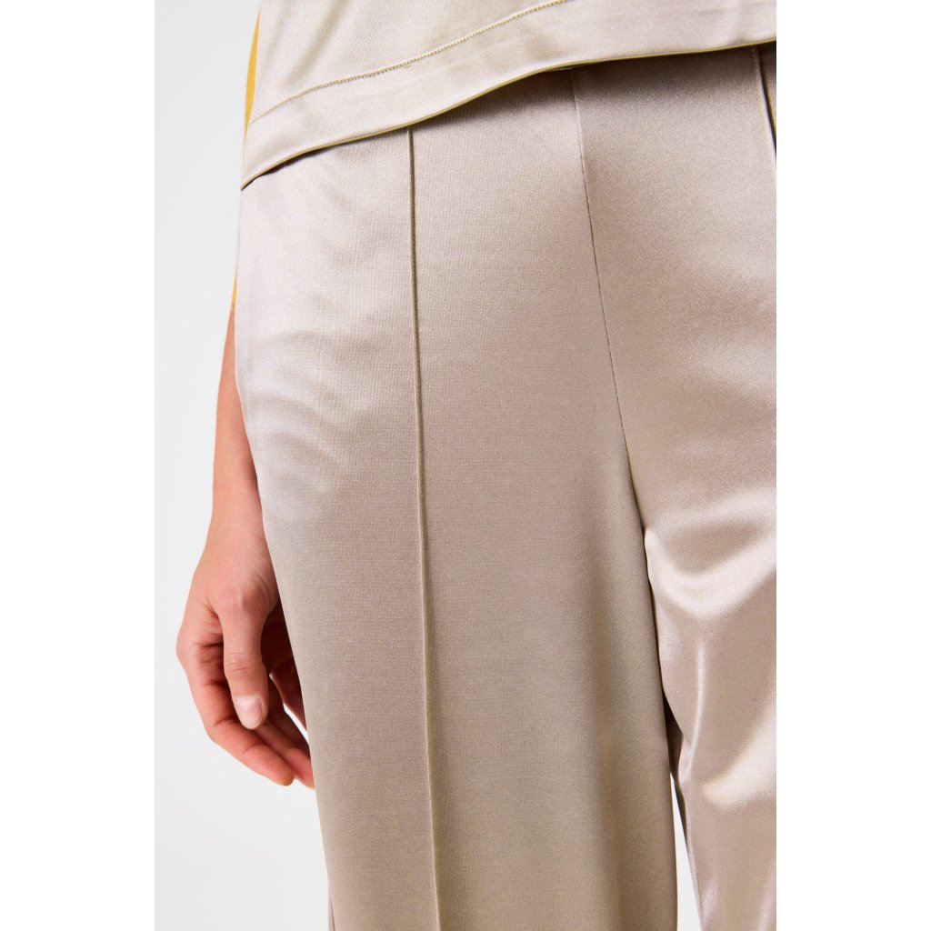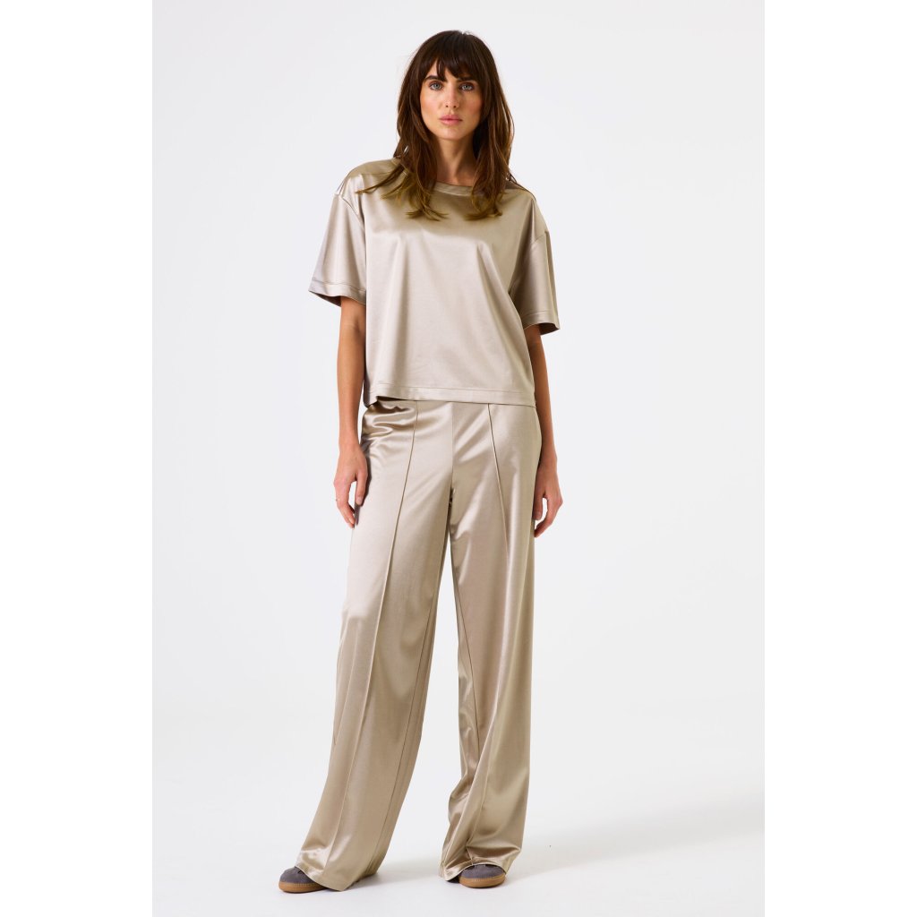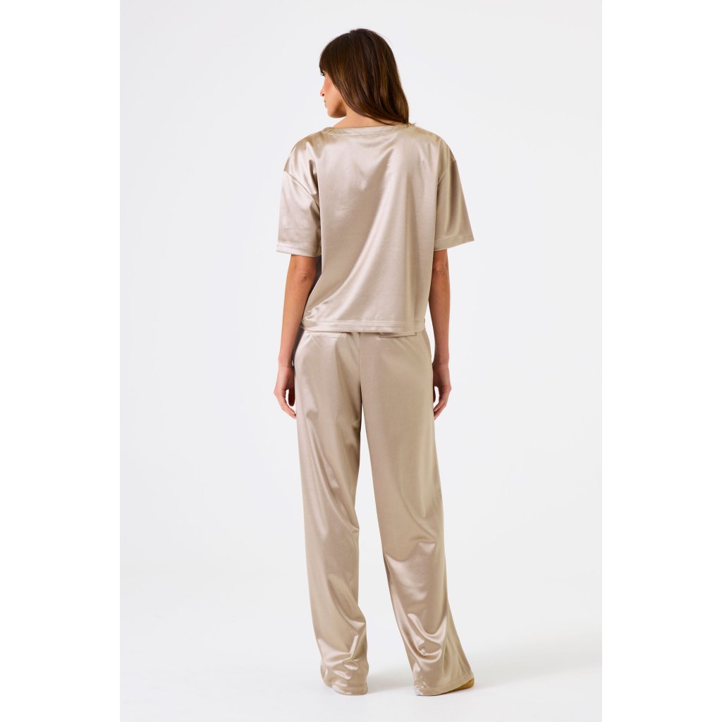 Tieto elegantné zlaté nohavice od značky Garcia sú stelesnením luxusu a pohodlia v jednom. Vyrobené z jemne lesklej saténovej tkaniny, dodávajú outfitu sofistikovaný vzhľad a pôvabný pohyb pri každom kroku. Strih je voľný a rovný, s vyšším pásom a záhybmi vpredu, ktoré krásne predlžujú siluetu. Nohavice majú skrytý zapínací systém a bočné vrecká, vďaka čomu pôsobia moderne a prakticky zároveň. Perfektné na spoločenské udalosti, večerné príležitosti, ale aj na ležérny mestský look v kombinácii s jednoduchým topom alebo košeľou.Dodatočné parametre