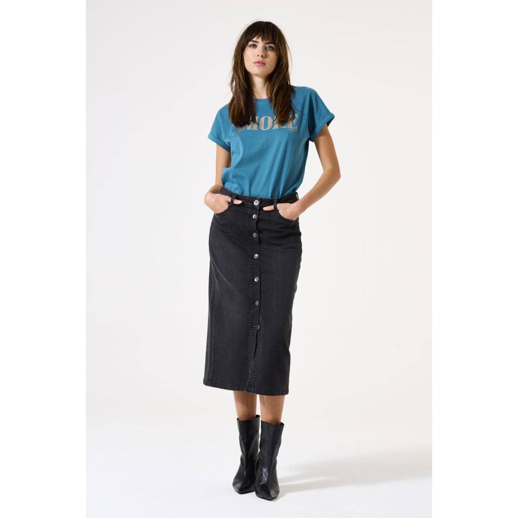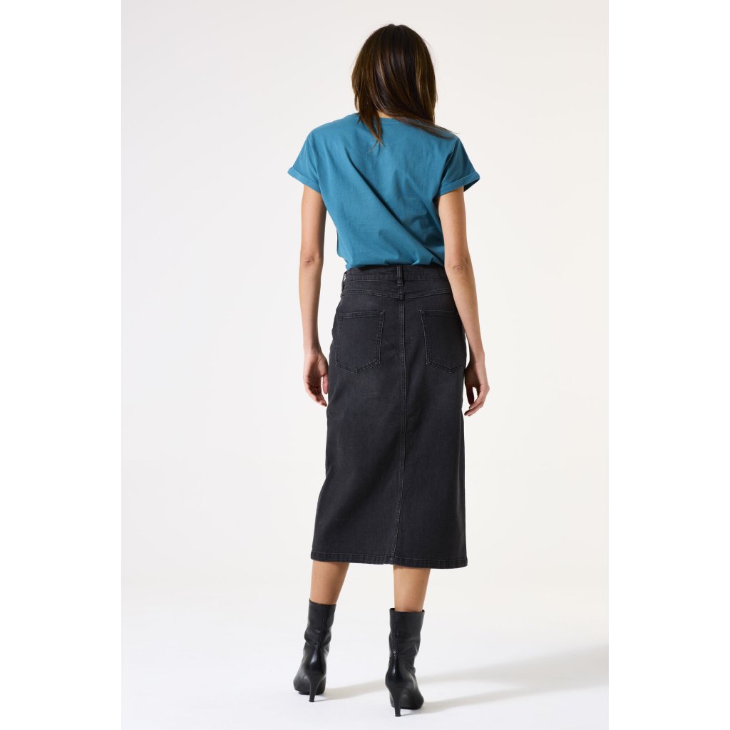 Čierna midi sukňa z denimu s vysokým pásom predstavuje moderný kúsok, ktorý zvýrazní ženskú siluetu. Úzky strih v kombinácii s predným zapínaním na gombíky pôsobí elegantne, no zároveň ležérne. Sukňa siaha pod kolená a vďaka rozparku v zadnej časti ponúka pohodlie pri pohybe. Vyrobená je z príjemného denimu s podielom recyklovanej bavlny a elastanu, ktorý sa mierne prispôsobí postave. Skvele sa hodí k tričku, blúzke aj svetru – ideálna voľba na každodenné nosenie.Dodatočné parametre