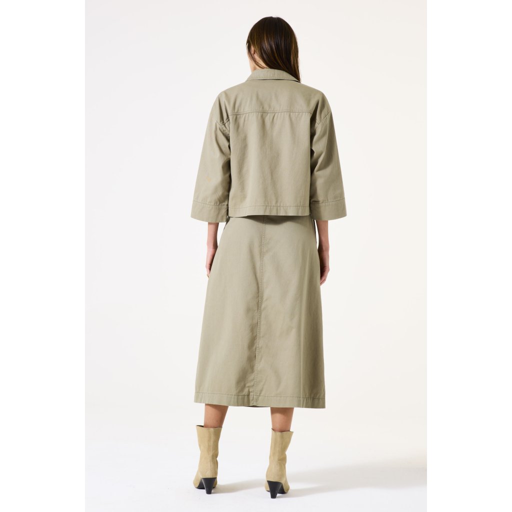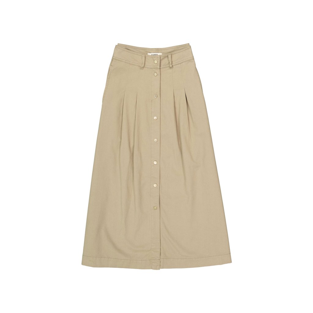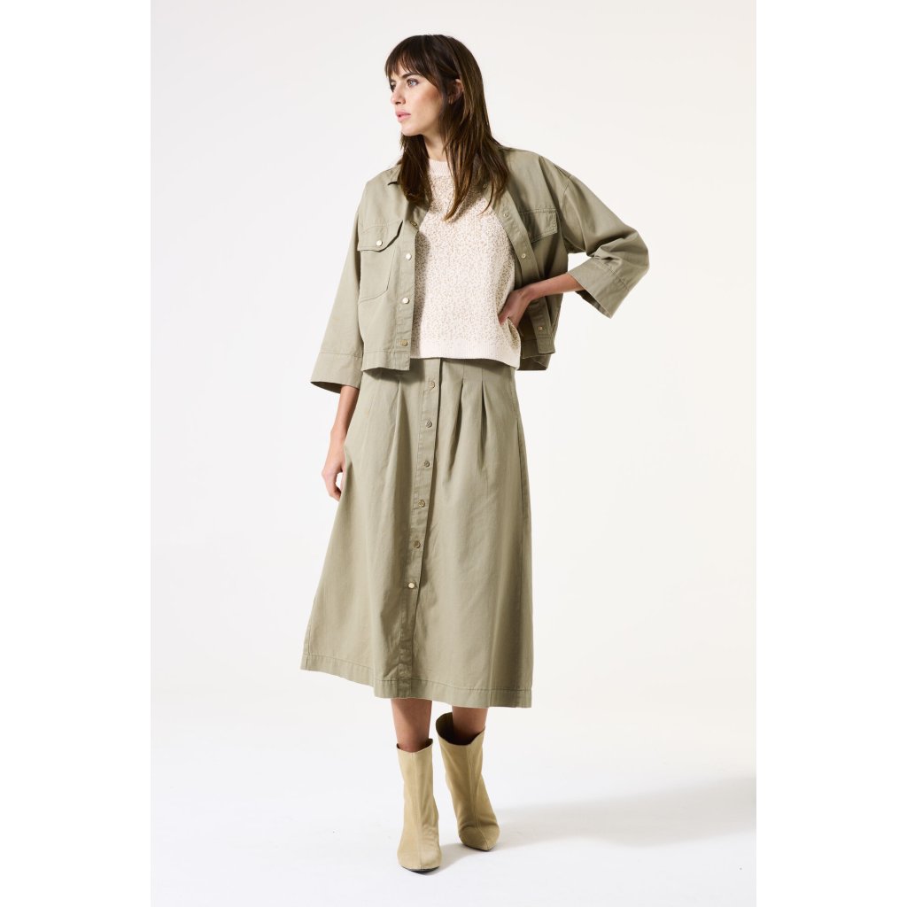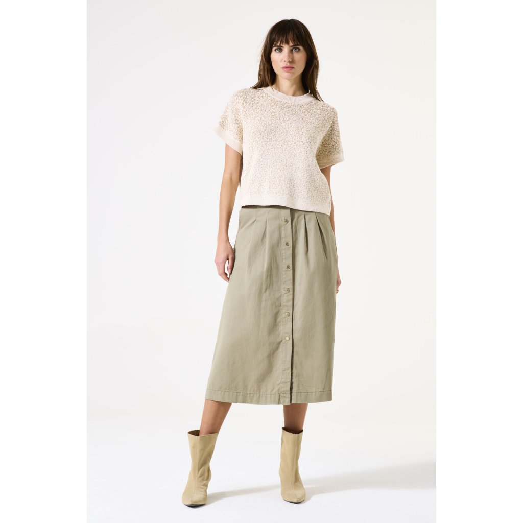 "Táto dámska sukňa od značky Garcia je stelesnením ležérnej elegancie a ženského minimalizmu. Vyrobená zo 100 % bavlny, ponúka prirodzený vzhľad, jemnú štruktúru a maximálne pohodlie počas celého dňa. Sukňa má vysoký pás a rovný, mierne voľný strih, ktorý lichotí postave a zároveň umožňuje voľný pohyb. Prednú časť zdobia decentné záhyby a rad kovových gombíkov, ktoré modelu dodávajú moderný a sofistikovaný vzhľad. Dĺžka pod kolená robí z tohto kúsku univerzálny doplnok šatníka – ideálny na každodenné nosenie aj elegantnejšie príležitosti. Dostupná v jemnej zelenej farbe."Dodatočné parametre