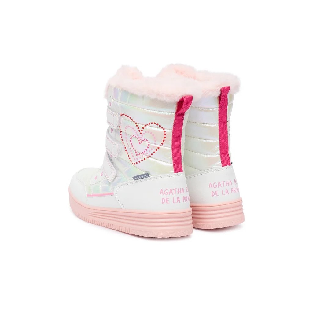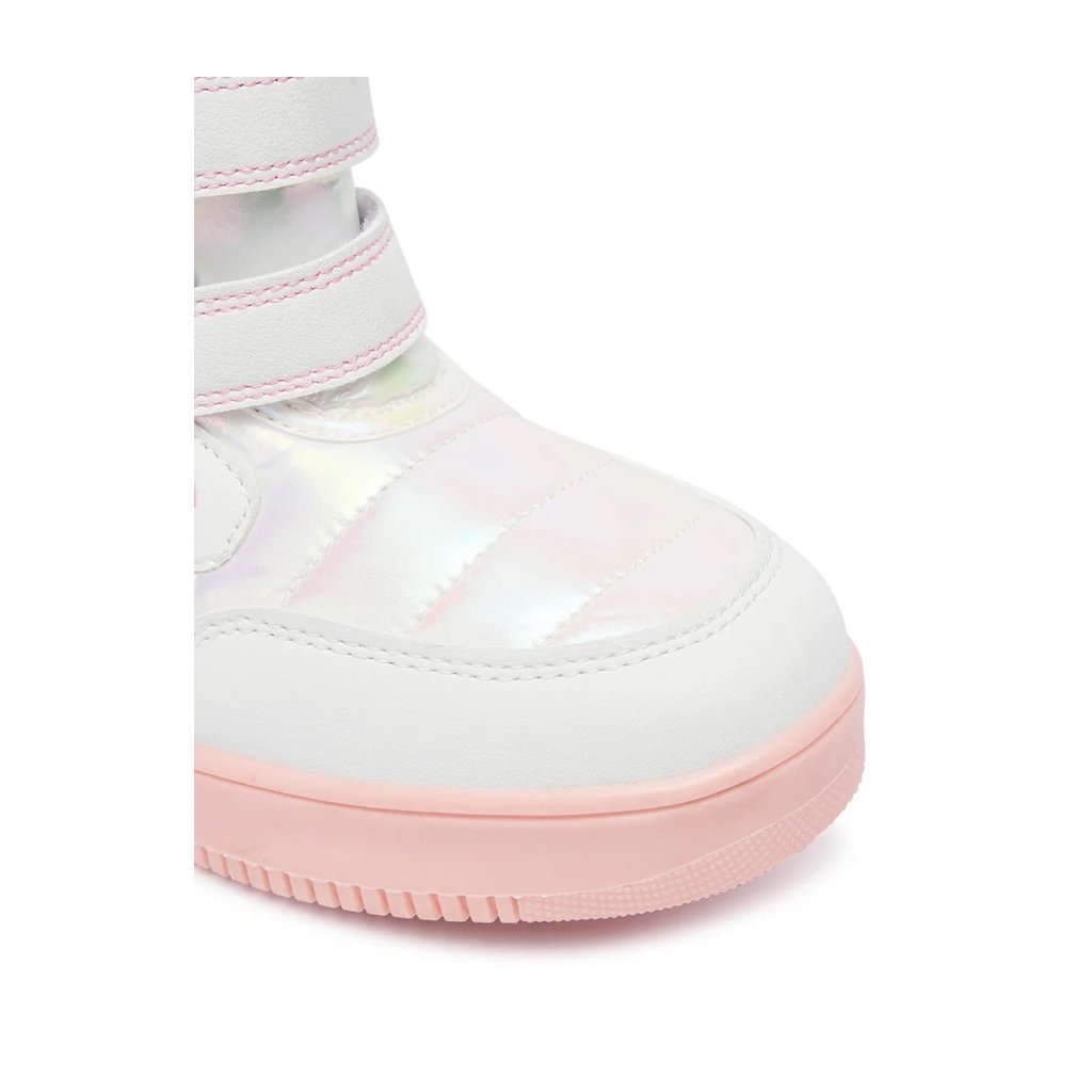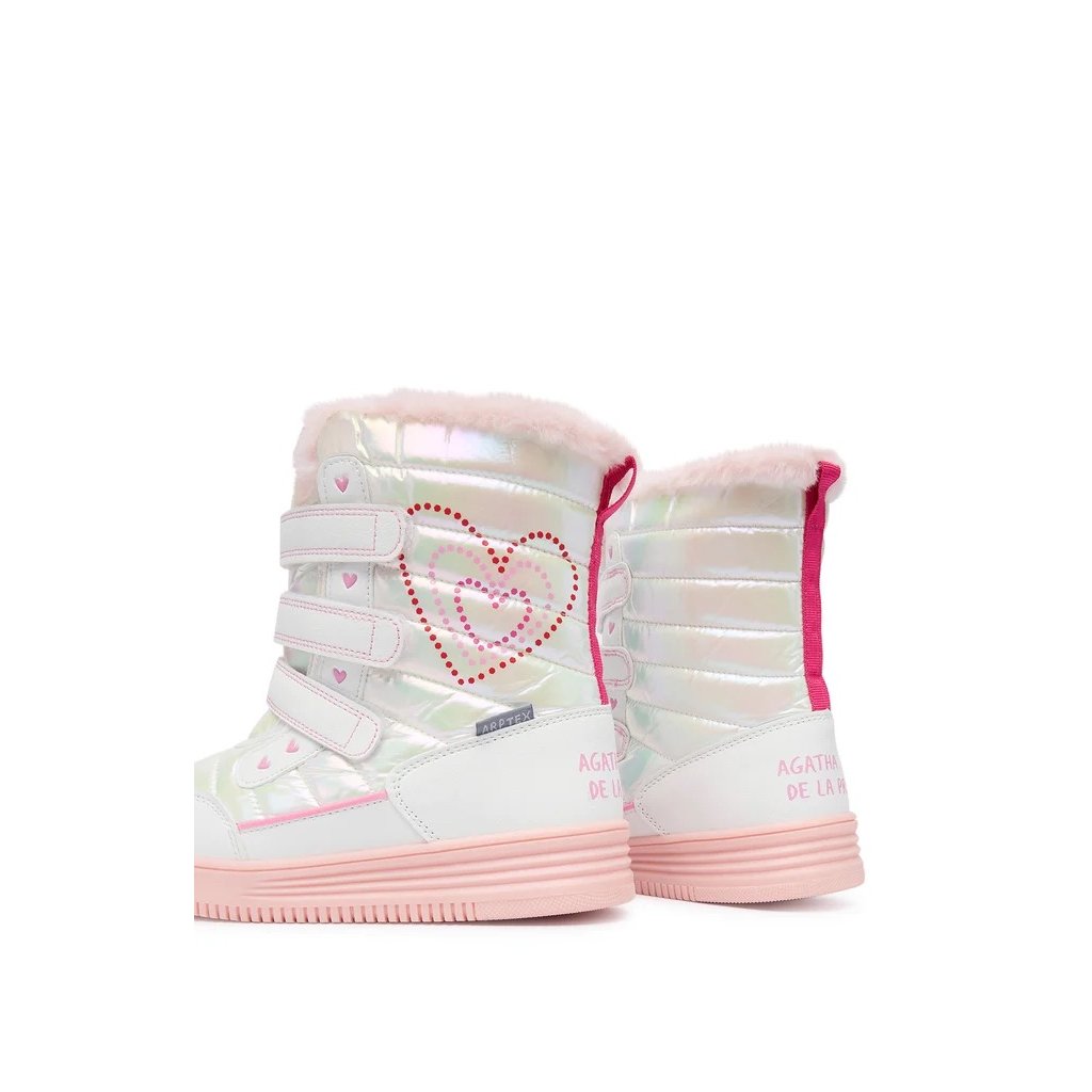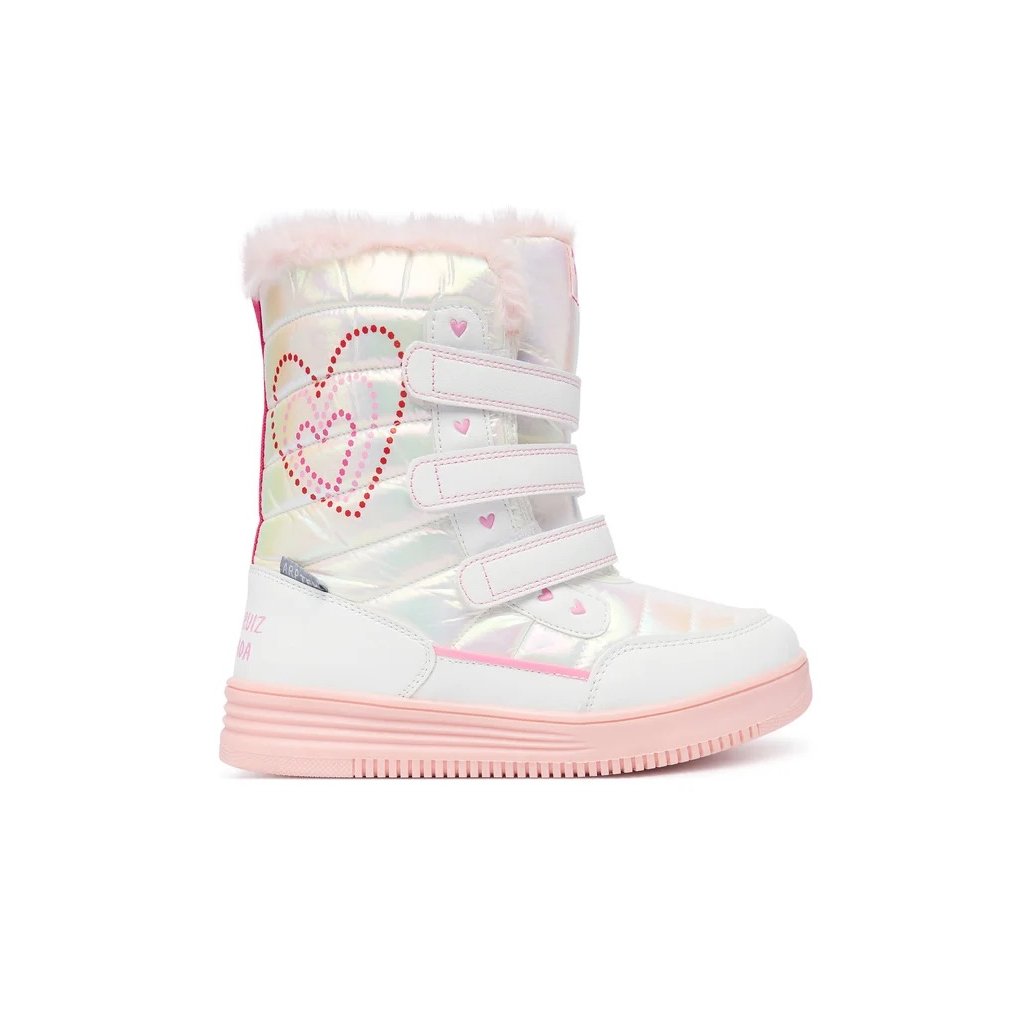 Štýlové zimné snehule v bielom prevedení s ružovými detailmi a ozdobným srdiečkom na boku. Vnútro je mäkko zateplené, čo zabezpečí teplo a pohodlie počas chladných dní. Praktické zapínanie na suchý zips uľahčuje obúvanie a pevná podrážka poskytuje stabilitu pri chôdzi. Ideálne na zimné prechádzky aj hry v snehu.