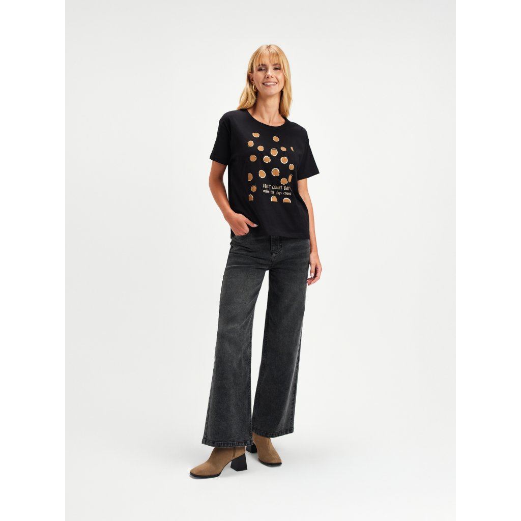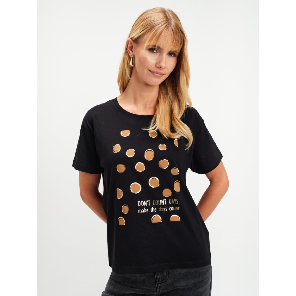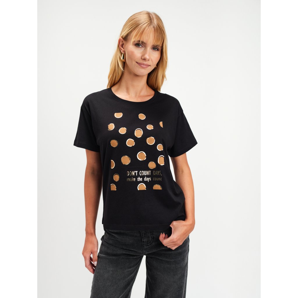 Dámske čierne tričko od značky Top Secret je stelesnením nenúteného štýlu a pohodlia. Vyrobené z kvalitnej bavlny, poskytuje maximálny komfort počas celého dňa a zároveň si zachováva moderný vzhľad. Originálna potlač so zlatými bodkami a motivačným nápisom dodáva tričku jedinečný charakter a jemný nádych elegancie. Vďaka voľnejšiemu strihu sa ľahko kombinuje – perfektne sa hodí k džínsom, sukni aj elegantným nohaviciam.Dodatočné parametre