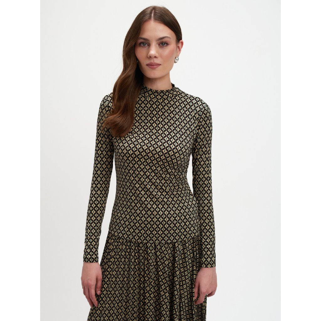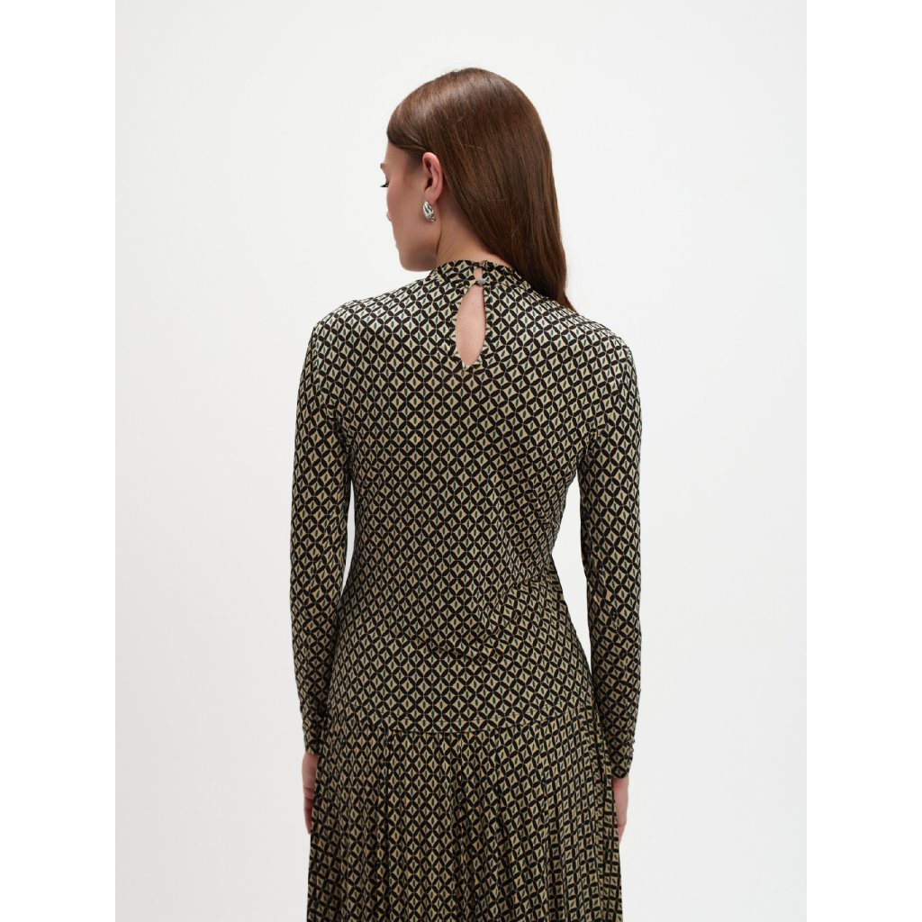 Elegantný top od značky Top Secret pôsobí mimoriadne štýlovo a zároveň nadčasovo. Vyznačuje sa zaujímavým geometrickým vzorom, ktorý okamžite pritiahne pozornosť a dodá outfitu moderný charakter. Vysoký golier a priliehavý strih krásne zvýraznia siluetu, zatiaľ čo dlhé rukávy dodávajú kúsku eleganciu a všestrannosť – ideálny je do práce, na spoločenské stretnutia aj na každý deň, keď chcete pôsobiť upravene a chic. Tento top je dokonalou voľbou pre ženy, ktoré milujú kombináciu ženskosti a sofistikovanosti. Pre dokonalý outfit odporúčame kombinovať so sukňou s rovnakým vzorom z našej novej kolekcie.Dodatočné parametre