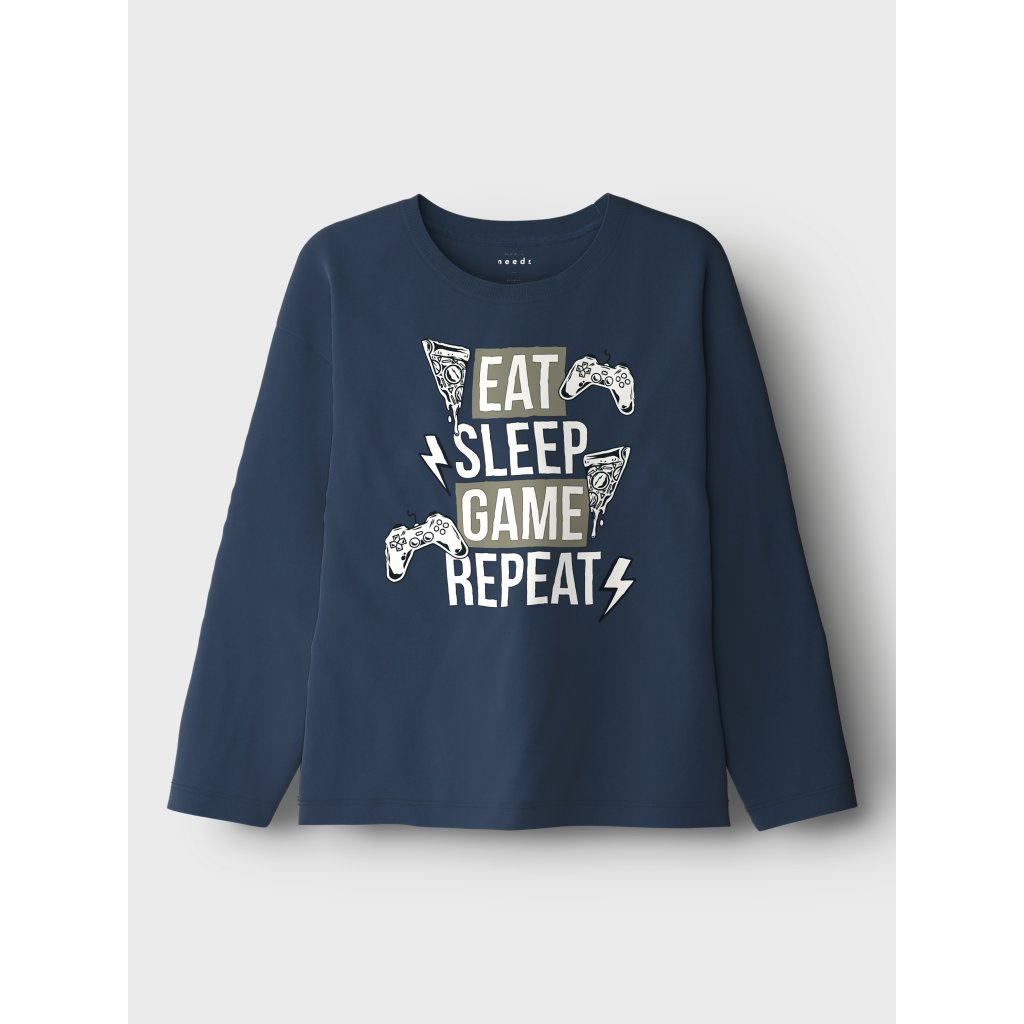 Štýlové tričko pre všetkých malých hráčov od značky NAME IT. Tmavomodré tričko s dlhým rukávom je vyrobené z príjemnej a priedušnej bavlny, ktorá zabezpečí maximálne pohodlie počas celého dňa. Prednú časť zdobí výrazná potlač s nápisom „Eat Sleep Game Repeat“, doplnená o herné ovládače, pizzu a blesky – ideálna kombinácia pre každého fanúšika videohier.Dodatočné parametre