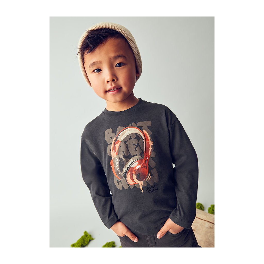 Moderné chlapčenské tričko s dlhým rukávom od značky Mayoral je perfektnou voľbou na každodenné nosenie počas chladnejších dní. Vyrobené zo 100 % kvalitnej bavlny, zaručuje maximálne pohodlie, mäkkosť a priedušnosť počas celého dňa. Tmavosivý model zaujme nápaditou potlačou veľkých slúchadiel v oranžovo-červenom tóne doplnenou o nápis „Beat Grey Crew“, ktorá tričku dodáva moderný, mestský vzhľad.Dodatočné parametre
