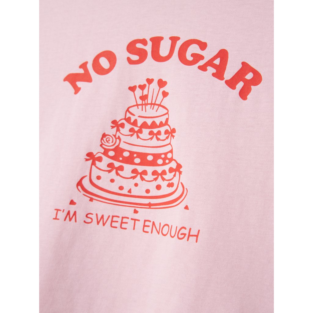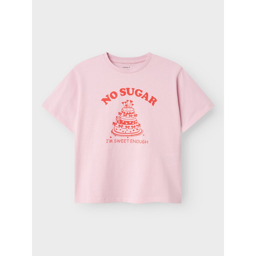 Sladké aj bez cukru! Toto ružové tričko od značky NAME IT rozžiari šatník každej malej slečny. Vyrobené zo 100 % organickej bavlny, je jemné k pokožke, priedušné a ideálne na celodenné nosenie – či už do školy, na ihrisko alebo na rodinný výlet. Vtipná potlač s tortou a nápisom „NO SUGAR – I’M SWEET ENOUGH“ je ako stvorená pre malé dievčatá, ktoré majú veľkú dávku šarmu aj bez cukru. Svetloružová farba a kontrastná červená grafika dodávajú tričku moderný a zároveň rozkošný vzhľad.Dodatočné parametre