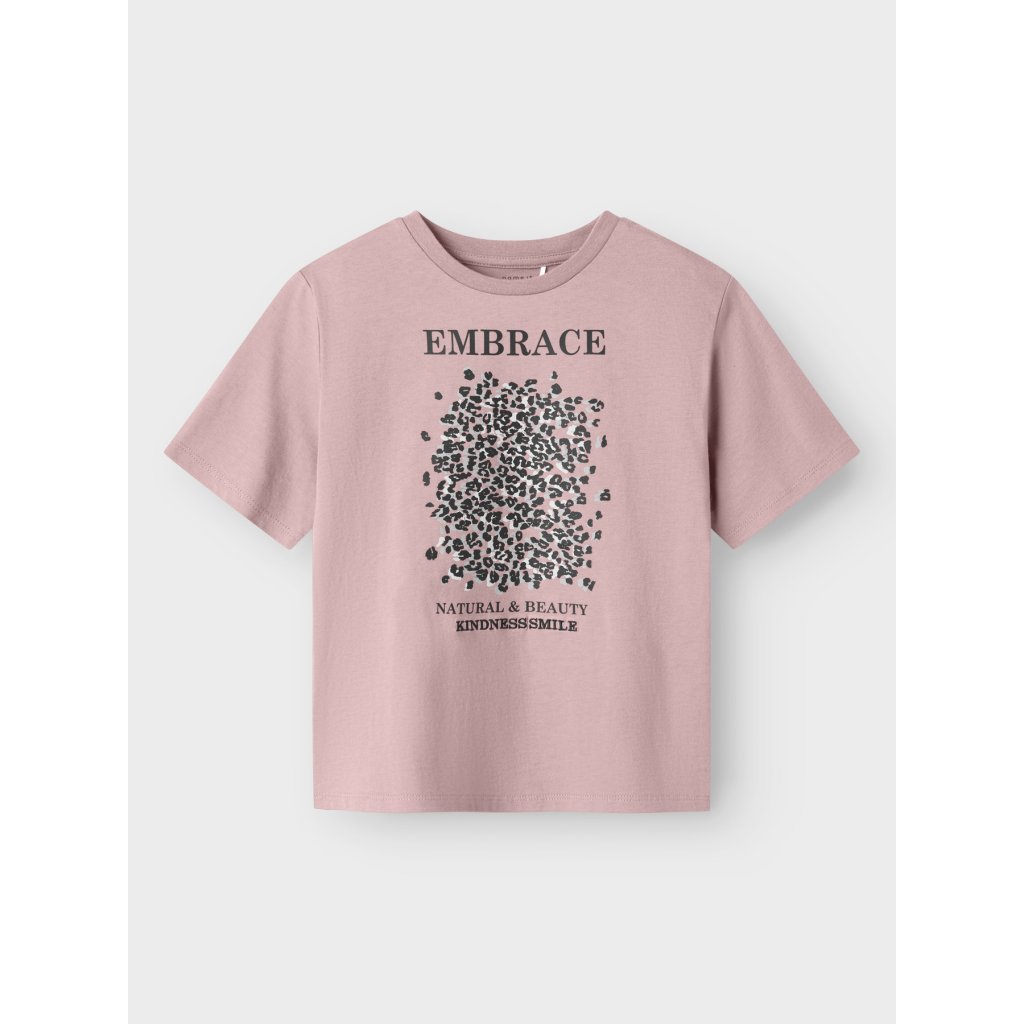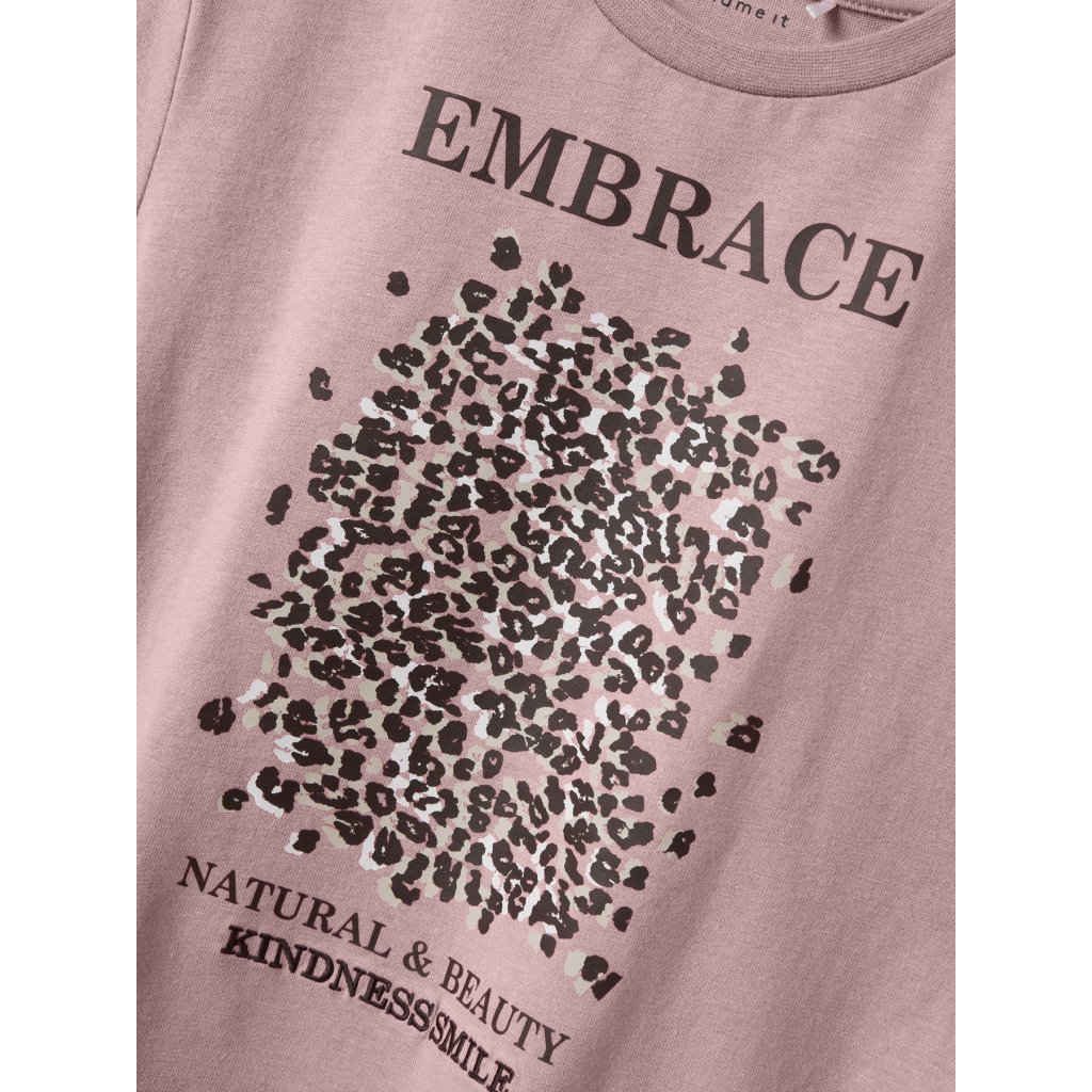 Toto milé tričko v nežnom ružovom odtieni od značky NAME IT si získa každé dievča, ktoré má rado pohodlie, štýl a pozitívne myšlienky. Vyrobené zo 100 % organickej bavlny, je mäkučké, príjemné na nosenie a zároveň šetrné k prírode – ideálne na každý deň. Prednú stranu zdobí moderná potlač so slovom „EMBRACE“ (v preklade „prijmi“) a zaujímavým vzorom, ktorý pripomína srdce plné drobných fliačikov. Pod ním nájdeme nápisy „Natural & Beauty“ a „Kindness Smile“, ktoré pripomínajú, že krása ide ruka v ruke s láskavosťou a úsmevom.Dodatočné parametre
