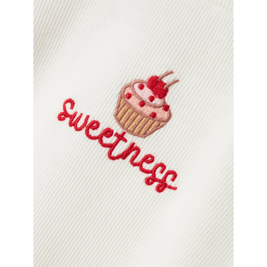 Rozkošné, jemné a pohodlné – toto dievčenské tričko od značky NAME IT si zamiluje každé dieťa aj rodič. V smotanovo bielej farbe pôsobí elegantne a čisto, no zároveň hravo vďaka výšivke malého muffinu s nápisom “Sweetness”. Vyrobené z kvalitnej organickej bavlny s prímesou elastanu, zaručuje príjemný pocit na pokožke, výbornú priedušnosť a miernu pružnosť pre maximálne pohodlie pri nosení. Rebrovaná štruktúra materiálu dodáva tričku zaujímavý vzhľad a jemný retro nádych.Dodatočné parametre